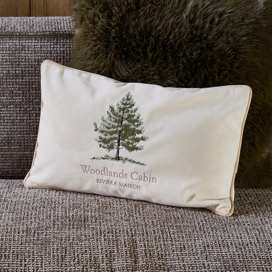 De voorkant is voorzien van een boom met letters; Woodlands Cabin / Riviera Maison